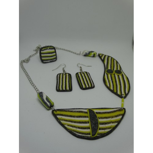 unikatni komplet ovratnice, prstana in uhanov v rumeno sivo beli barvi, možen nakup tudi posameznih izdelkov